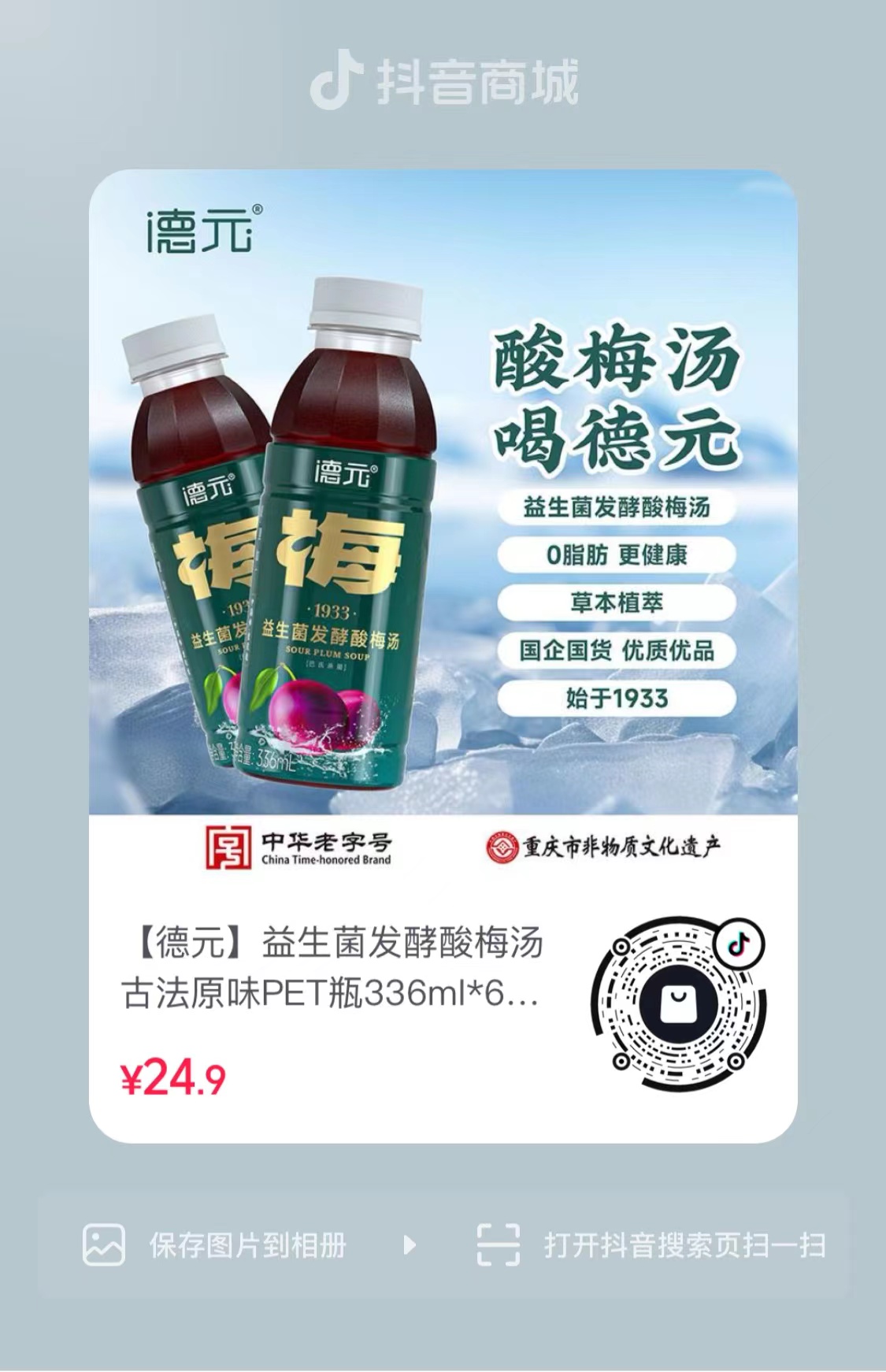 产品描述:1933年江苏人朱元章、重庆人陈德在较场口合伙创建“德元”食店,1964年被评为重庆名小吃,2021年德元与江西南昌大学食品学院联合研发德元酸梅汤非物质文化遗产制造工艺的工业化生产项目。草本植萃、0脂0防腐、益生菌发酵。