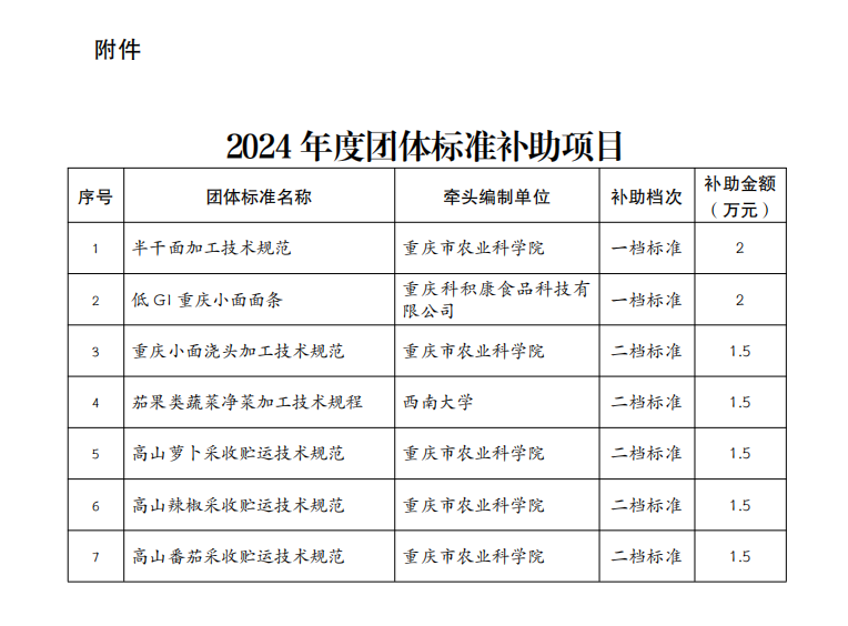 按照《重庆市农产品加工业技术创新联盟2024年度团体标准补助方案》有关规定,经公开征集、立项评审、专家审查、综合评定、社会公示等程序,现将市农产品加工业技术创新联盟2024年度团体标准补助项目予以公布。
